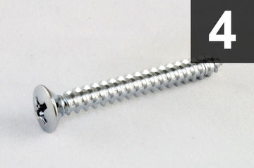 ALL PARTS GS3005010. Set de cuatro tornillos cortos para placa de mástil con cabeza tipo Phillips de #8 x 1-3/8" cromados.