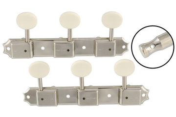 Economy vintage style tuning keys, 3 x 3, with plastic keystone buttons. Nickel finish. 14:1...