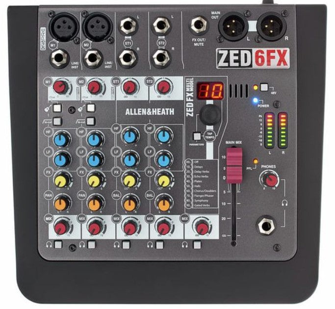 ALLEN & HEATH ZED6 FX. Mesa de mezclas de seis canales con efectos para músicos, cantantes, compositores y locales pequeños.