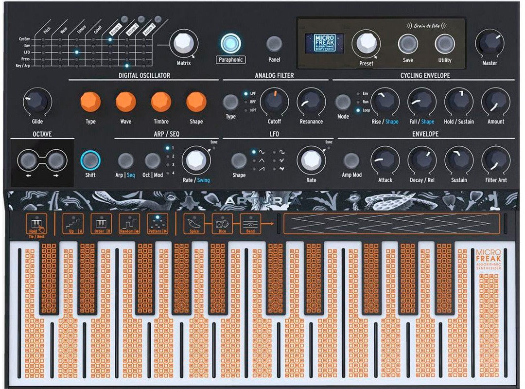 ARTURIA MICROFREAK. Sintetizador con teclado plano con poli-aftertouch que mezcla tablas de onda y osciladores digitales con filtros analógicos dando lugar a sonidos curiosos.