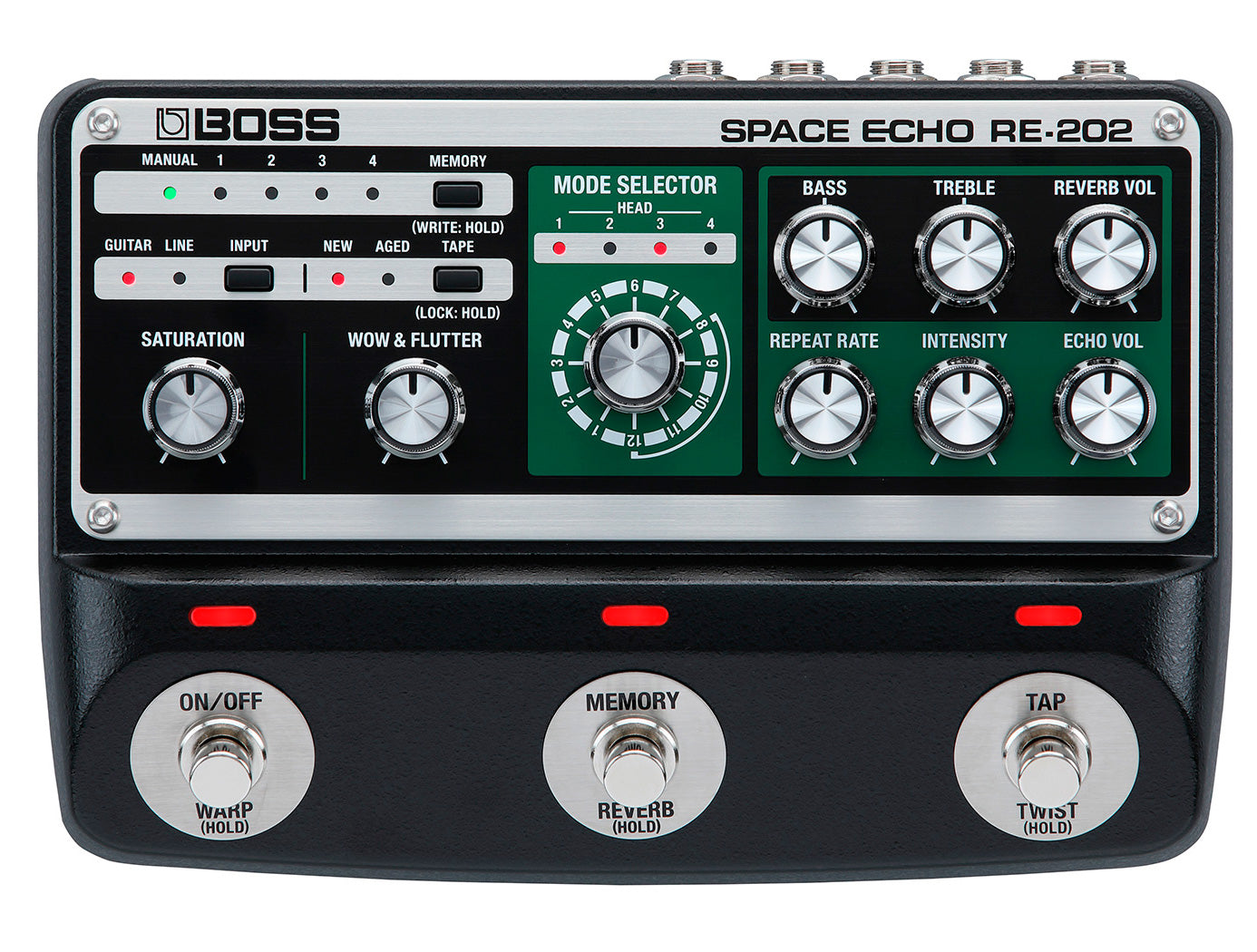 BOSS RE-202. Pedal de efecto de eco de cinta basado en el Roland RE-201 Space Echo de 1974 con nuevas características para adaptarse a los tiempos actuales.