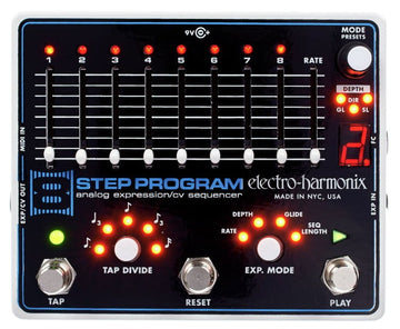 EHX 8-STEP PROGRAM. Secuenciador analógico que se conecta a la entrada de un pedal de expresión para controlar diferentes parámetros. También se puede conectar a aparatos que tienen entradas de Control de Voltaje (CV).
