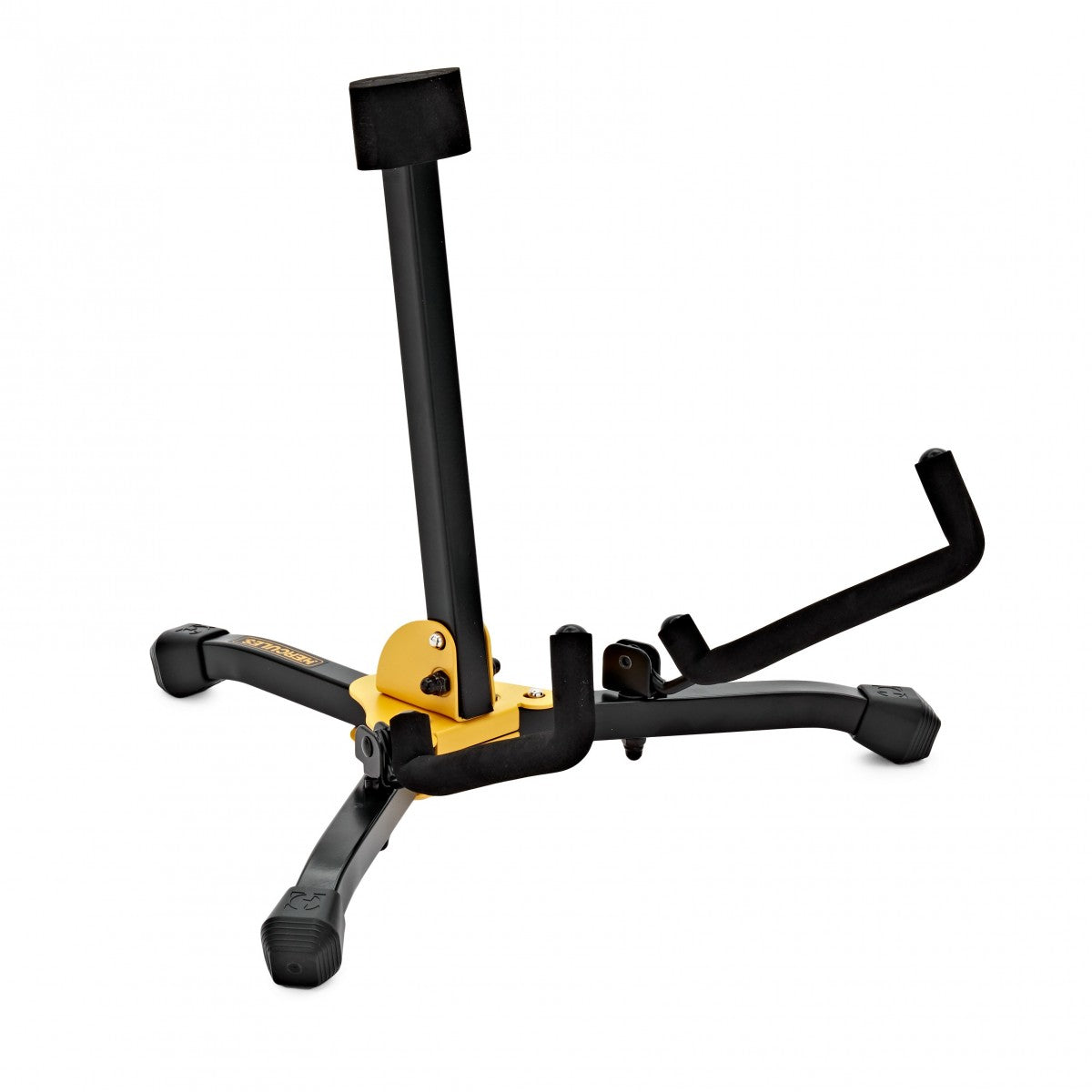 GS401B. Mini Soporte de guitarra acústica Diseñado en una sola pieza para un transporte y empaquetado más sencillo Pins de bloqueo rápido en la base para mayor seguridad El caucho SFF en las patas provee una base estable a tus instrumentos Peso: 0.9kg Radio de la base: 260mm Mástil de apoyo: 140mm Tamaño plegado: 285x100 mm