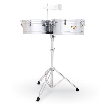 LATIN PERCUSSION M257. Timbales de la serie Matador de 14 y 15" con cascos de acero y sistema de afinación tradicional. Incluye cencerro Matador, soporte, llave de afinación y baquetas. Acabado: Cromado.