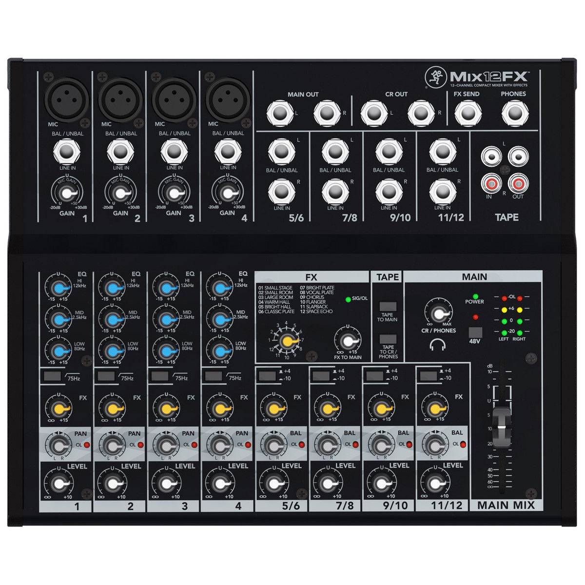 MACKIE MIX12FX. Mesa de mezclas de 12 canales con umbral alto y rendimiento de bajo ruido. Contiene 12 efectos de reverb, chorus y delay.