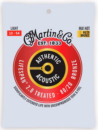 MARTIN MA140T. Juego de cuerdas para guitarra acústica de la serie Authentic LifeSpan 2.0 Bronze 80/20 con un tratamiento anti-corrosivo que no compromete el tono de la cuerda. Calibre: .012 - .054.