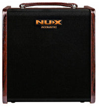 NUX AC80. Amplificador para guitarra acústica de la serie Stageman con una potencia de 80W, altavoz de 6.5 pulgadas, tweeter de 1", dos canales, efectos y batería recargable.
