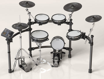 NUX DM8. Set de batería electrónica compuesto por un módulo de sonido con 48 kits de batería de estudio, parches de malla, 3 x toms de 10 pulgadas, 1 x caja independiente de 12 pulgadas con soporte, pad de bombo de 10" con pedal, 2 x crash de 12", 1 x ride de 14" y 1 x hi-hat de 12" con soporte.
