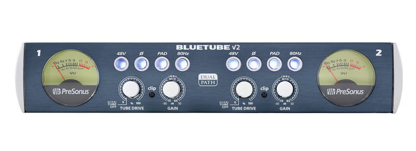PRESONUS BLUE TUBE DP V2. Preamplificador de doble circuito para micrófono e instrumento XMAX de clase A con válvula para ofrecer un tono más cálido y suave.