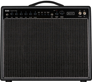 REVV D25. Amplificador combo a válvulas para guitarra eléctrica con una potencia de 25 o 5W, altavoz Celestion Vintage 30 de 12 pulgadas que ofrece tonos de alta ganancia incluyendo la reactive load de Two notes con simulaciones de pantalla. Color: Negro.