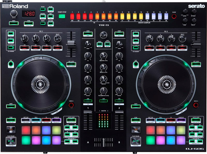 ROLAND DJ-505. Controlador para DJ con dos canales y cuatro decks que mezcla las funciones de interpretación de Serato DJ con los sonidos y secuenciadores de las cajas de ritmos TR-808, TR-909, TR-606 y TR-707.