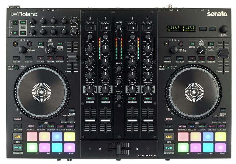 ROLAND DJ-707M. Controlador para DJ de 4 canales con gestión de altavoces compatible con Serato DJ Pro.
