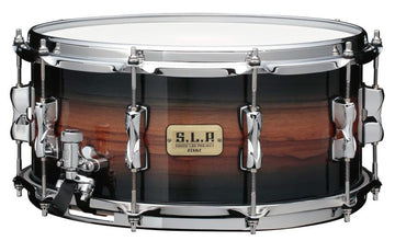 TAMA LBM1465Z-MZB. Caja para batería acústica de la serie S. L. P., Sound Lab Project, con un tamaño de 14 x 6.5 pulgadas y casco de bubinga y arce más una capa externa de zebrawood. Acabado: Midnight zebrwood burst.